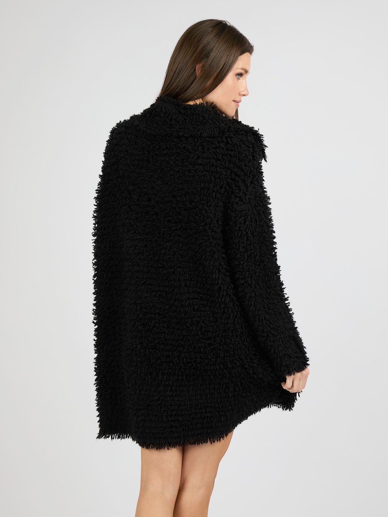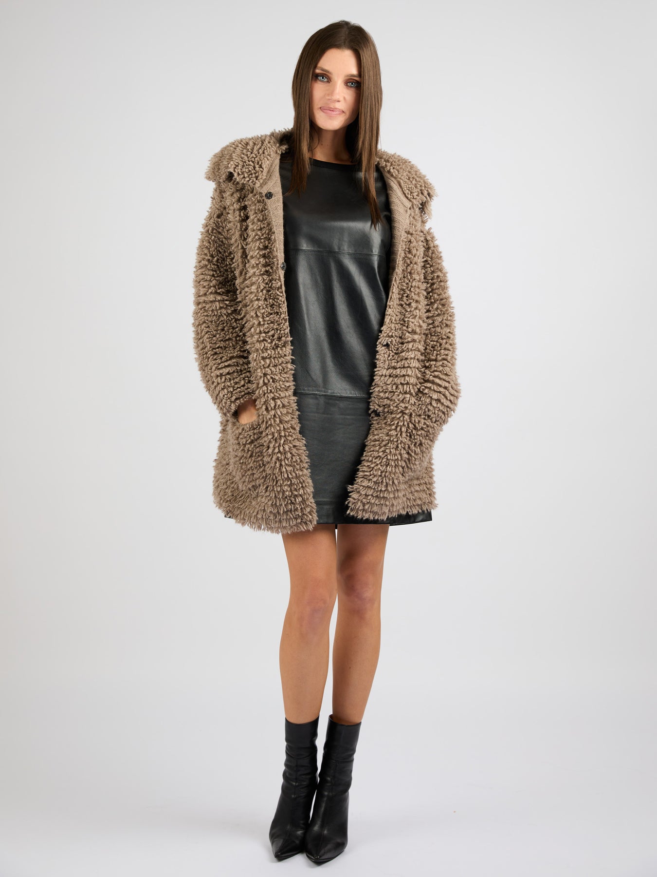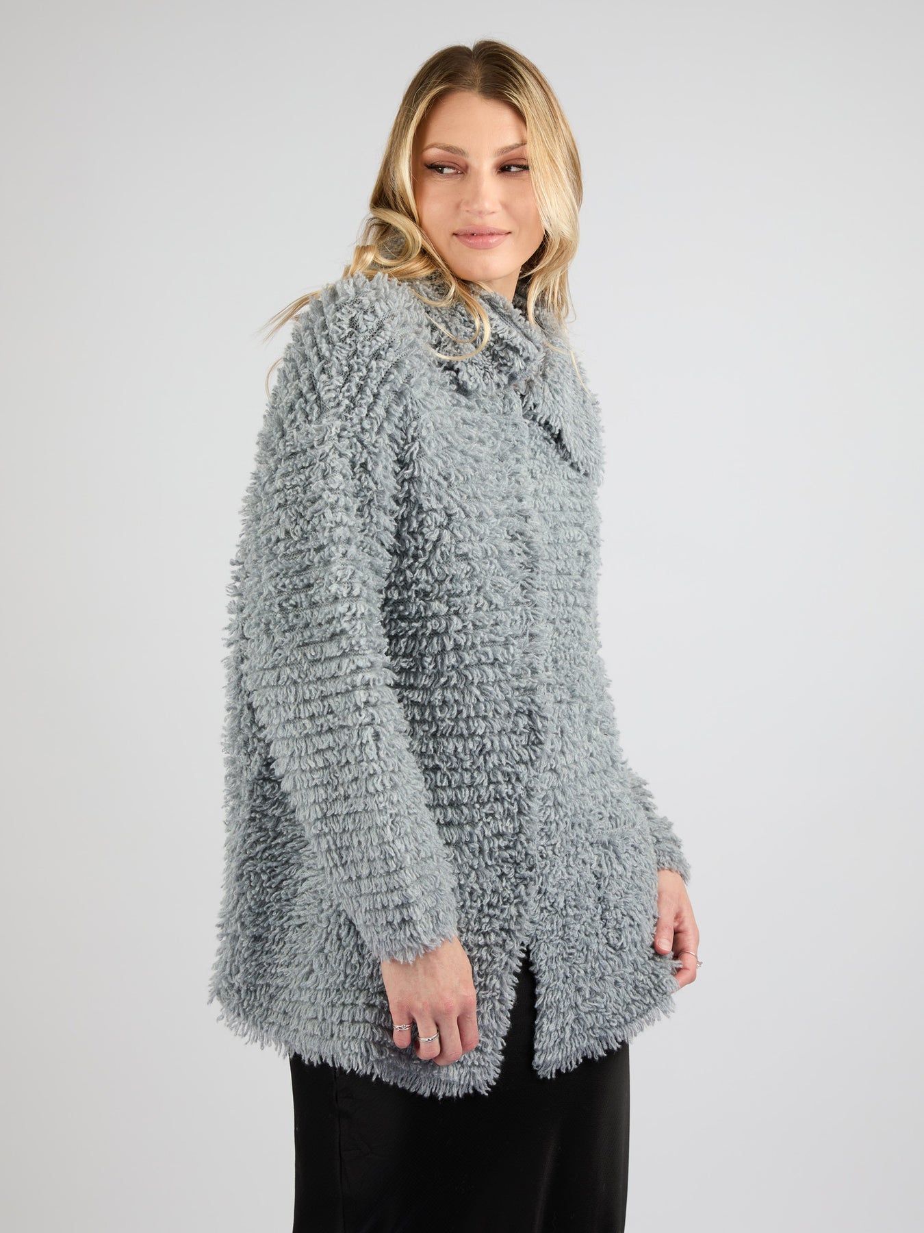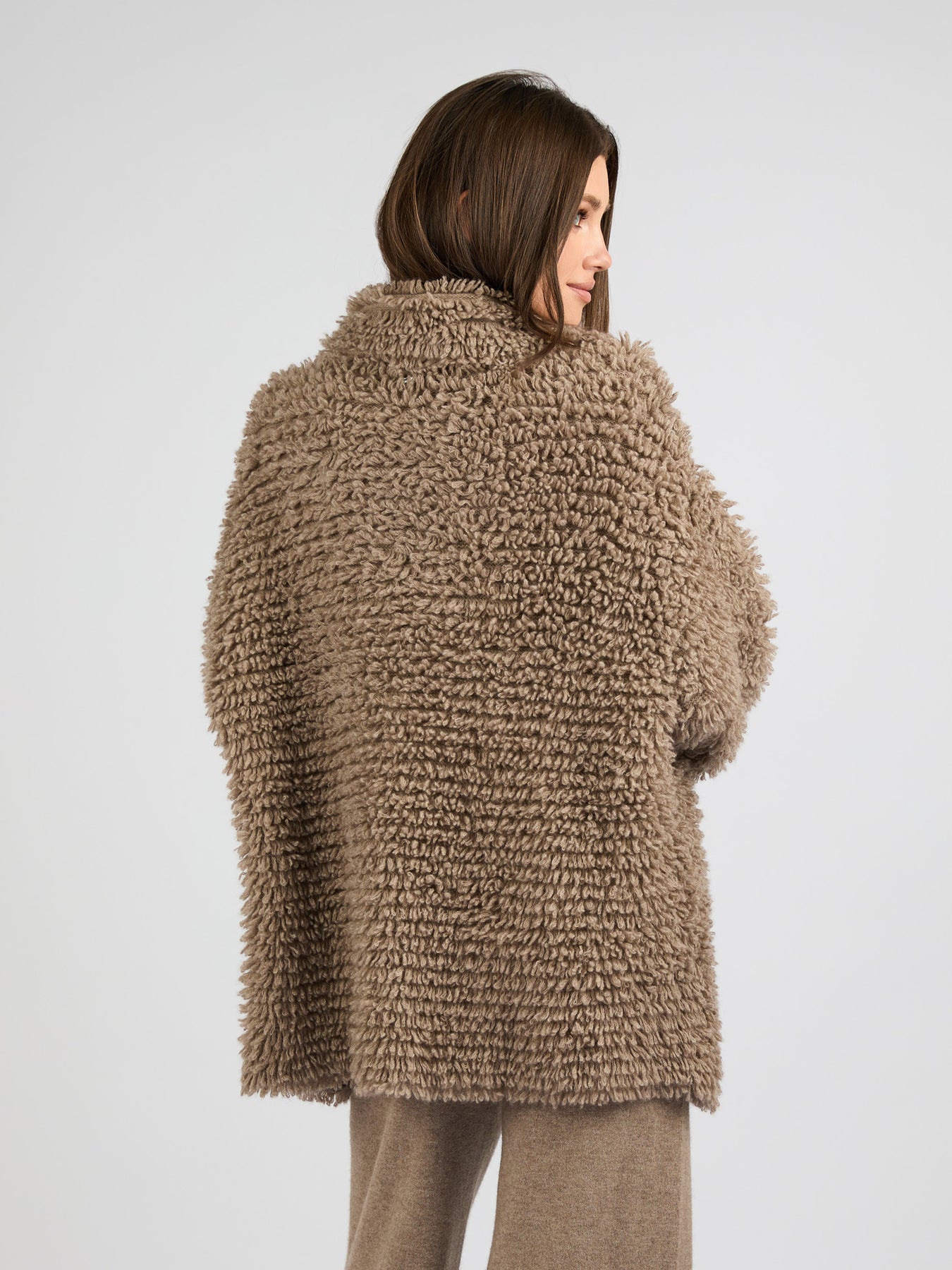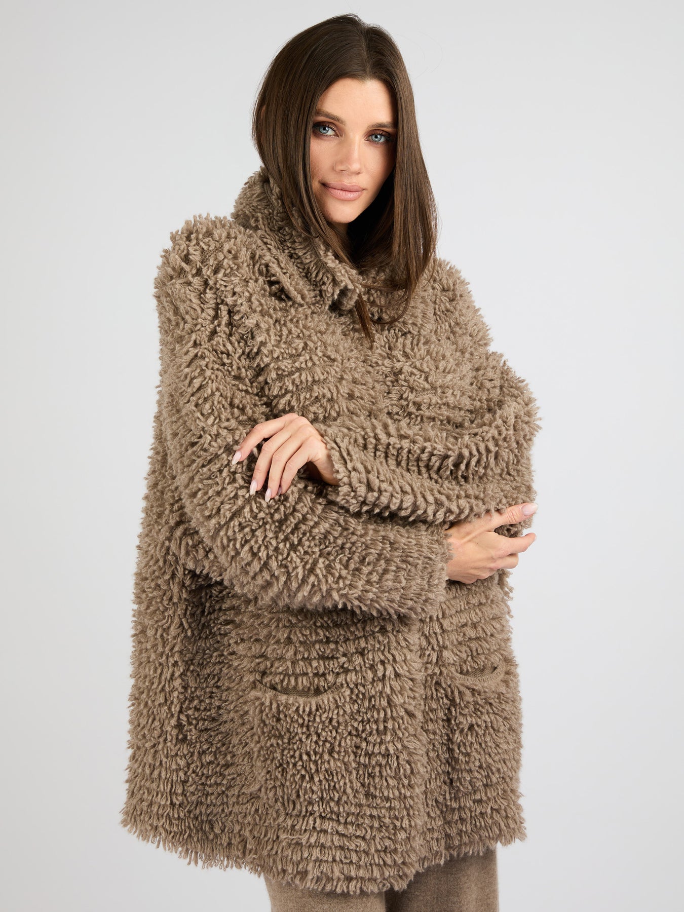 Experience the modern code of elegance with the MONT BLANC COAT, a generously fitted 3/4 length jacket crafted from 100% Mongolian cashmere. Weighing 640 grams, its loop stitch knit creates a soft, textured fur effect that envelops you in warmth. Featuring a classic camp collar and practical patch pockets, this coat blends timeless style with luxurious coziness for elevated everyday elegance.